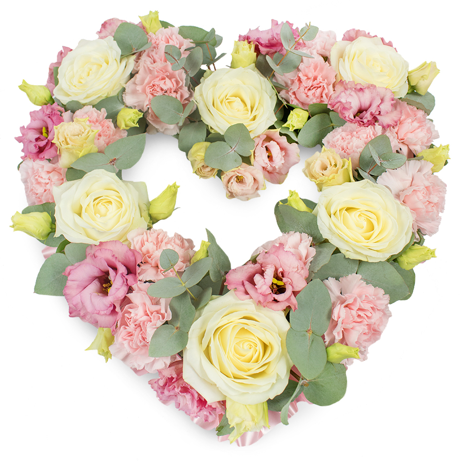 A full, heart-shaped floral wreath dominates the image, resting against a clean white background that highlights its soft colours and intricate workmanship. The heart form is complete and symmetrical, filled edge to edge with blossoms so that it looks lush and comforting, like a floral embrace. Cream and pale yellow roses form the main structural points of the design, their velvety, spiralled petals opening in generous, rounded blooms that speak of loyalty, devotion, and gentle respect. Threaded among them are numerous pastel pink carnations, clustered closely so that their frilled, multi-layered petals create a delicate, textured surface that softens every contour of the heart. Deeper tones come from magenta and mauve lisianthus blooms dotted throughout, their more open, cup-like shapes and slightly rippled edges adding visual interest and a romantic, almost dusk-like richness. Silvery-green eucalyptus leaves are interlaced between the flowers, their smooth, rounded foliage cooling the palette and providing a fresh, herbal backdrop that defines the heart's edges with subtle grace. Tiny yellow-green buds emerge here and there, fresh and tightly furled, symbolising new beginnings and quiet hope within a tribute meant for farewell. The overall mood is tranquil, tender, and reflective, making this heart wreath an ideal choice for funerals, memorials, or graveside tributes in and around Primrose Hill. Whether placed in a local chapel, carried to a service near Chalk Farm, or ordered from Florist Primrose Hill for a family gathering at home, it offers a beautifully crafted, heartfelt expression of sympathy and enduring love.
